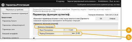 При входе в систему аппарата из операционной системы, например Windows, или приложения, использующего FTP, IPP или SNMPv3, блокировка может произойти раньше чем будет совершено заданное количество неудачных попыток.