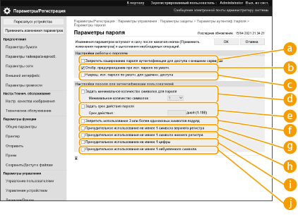 Установите этот флажок, чтобы экран для изменения пароля отображался при входе администратора в систему аппарата с помощью имени пользователя и пароля по умолчанию.