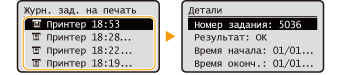 1 | В <Журнал заданий> выберите элемент выберите документ, журнал которого нужно просмотреть.<OK> отображается, если документ был успешно распечатан; <Ошибка> отображается, если документ не был распечатан, так как печать была отменена или произошла ошибка. ![]() Отображается подробная информация о документе. |