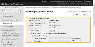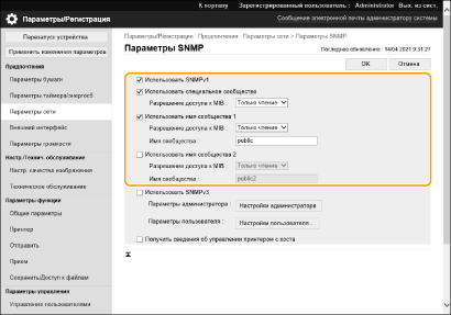 Простой протокол управления сетью (SNMP) — протокол для мониторинга и управления устройствами связи в сети с помощью базы управляющей информации (MIB). Аппарат поддерживает SNMPv1 и SNMPv3 с повышенной безопасностью. Состояние аппарата можно проверить с компьютера при печати документов или использовании удаленного интерфейса пользователя. Вы можете включить либо SNMPv1, либо SNMPv3, либо обе версии одновременно. Настройте параметры для каждой версии, соответствующие вашей сетевой среде и цели использования.
