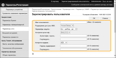 3 | Нажмите [Настройки пользователя]  [Регистрация]. [Имя пользователя] Используя буквенно-цифровые символы, введите имя пользователя. [Разрешение доступа к MIB] Выберите [Чтение/Запись] или [Только чтение] для установки прав доступа к объектам MIB. [Чтение/Запись] | Позволяет просматривать и изменять значения объектов MIB. | [Только чтение] | Позволяет только просматривать значения объектов MIB. |