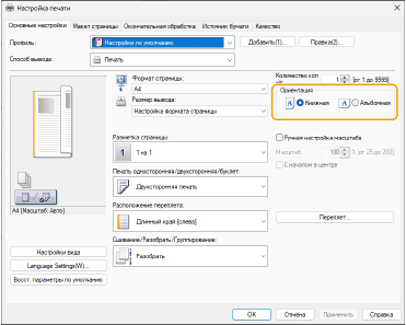 2 | На экране [Основные параметры] драйвера установите ориентацию [Ориентация], выбранную в шаге 1. |