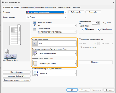 3 | В режиме предварительного просмотра выберите [Разметка страницы] [Порядок распол. страниц] [Печать односторонняя/двухсторонняя/буклет] [Расположение переплета]. |