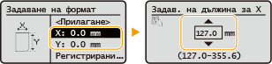 Задайте дължината на страната <X> и на страната <Y>. Натиснете <X> или <Y>, за да въведете дължината на всяка страна чрез числовите бутони или