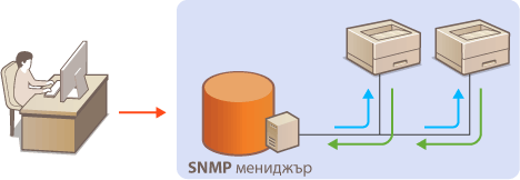 Когато софтуерът за управление SNMP е инсталиран на компютър в мрежата, той ви позволява да конфигурирате, наблюдавате и управлявате устройството дистанционно от компютъра. За повече информация вижте ръководствата за експлоатация за вашия софтуер за управление. |