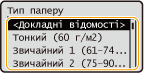 Щоб переглянути докладні параметри для типу паперу, виберіть <Докладні відомості>