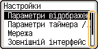 Можна змінювати різноманітні параметри, пов’язані з дисплеєм, наприклад мову інтерфейсу: <Параметри відображення> Ви можете змінити екран, що автоматично відображається, якщо пристрій не використовується протягом певного проміжку часу: <Функція після автоматичного скидання> Можна змінювати різноманітні параметри, пов’язані зі спеціальними можливостями, наприклад швидкість прокручування: <Спеціальні можливості> |