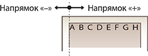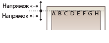 Коригування положення друку потрібне, коли позначки, що підтверджують положення друку, розташовані несиметрично. Напрям положення друку можна вказати за допомогою додатного (+) або від’ємного (-) значення, а відстань можна зазначити в міліметрах. Щоб виконати коригування по вертикалі, установіть від’ємне значення (-) для переміщення положення друку вгору або додатне (+) для переміщення вниз. Щоб виконати коригування по горизонталі, установіть від’ємне значення (-) для переміщення положення друку вліво або додатне (+) для переміщення вправо.