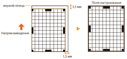 Після підтвердження напряму й відстані для коригування відкоригуйте положення друку. Положення друку можна коригувати в діапазоні від -3,5 до +3,5 мм як у горизонтальному, так і у вертикальному напрямку з кроком 0,1 мм.