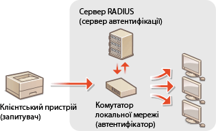 Якщо пристрій намагається підключитися до мережі 802.1X і почати обмін даними через неї, пристрій має пройти автентифікацію користувача, щоб довести, що підключення створено авторизованим користувачем. Інформація про автентифікацію надсилається до сервера RADIUS, який її перевіряє та дозволяє зв’язок із мережею або відхиляє його залежно від результату автентифікації. Якщо автентифікація не вдається, перемикач бездротової локальної мережі (або точка доступу) блокує доступ зовні мережі. Апарат може підключитися до мережі 802.1X як клієнтський пристрій. Налаштування параметрів автентифікації IEEE 802.1X