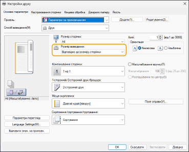 Установіть значення [Вихідний розмір] у драйвері принтера відповідно до формату паперу, на якому виконуватиметься друк.