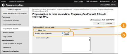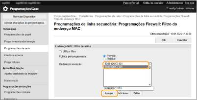 Se o endereço MAC for introduzido incorretamente, poderá não ser possível aceder à máquina a partir da Interface Remota. Neste caso, defina <Utilizar filtro> para <Desligado> para <Filtro de saída>/<Filtro de entrada> em <Filtro do endereço MAC> a partir do painel de controlo.