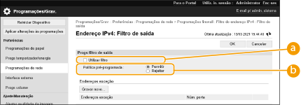 [Programações de rede] [Registo de bloqueio de endereços IP]. O histórico de comunicações bloqueadas pode ser exportado da Remote UI (Interface Remota) no formato de ficheiro CSV. Exportar um registo como ficheiroSe [Política pré-programada] estiver programada como [Rejeitar], o histórico de comunicações bloqueadas pela firewall não será apresentado em [Registo de bloqueio de endereços IP].