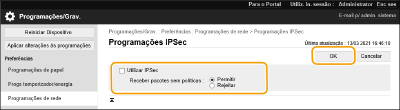 clique em [Apagar] [OK].Utilizar o painel de controloTambém pode ativar ou desativar a comunicação IPSec a partir de <Definições> no ecrã <Início>. <Definições IPSec>