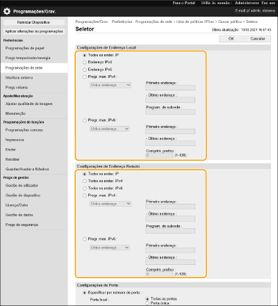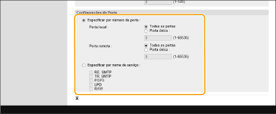 Selecione [Especificar por número de porta] para utilizar números de portas quando especificar as portas às quais o IPSec se aplica. Selecione [Todas as portas] para aplicar o IPSec a todos os números de porta. Para aplicar o IPSec a um determinado número de porta [Porta única] e introduza o número da porta. Especifique a porta desta máquina em [Porta local] e especifique a porta do par de comunicação em [Porta remota].