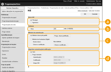Selecione o modo de operação do protocolo Key Exchange. A segurança é reforçada se selecionar [Principal] porque é codificada a sessão do IKE propriamente dita, mas a velocidade da sessão é mais lenta do que com [Agressivo], o qual não codifica toda a sessão.