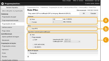 Modo de comunicaçãoEsta máquina apenas suporta o modo de transporte para a comunicação IPSec. Como resultado, a autenticação e a codificação são aplicadas somente às partes de dados dos pacotes IP.