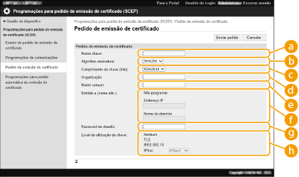 Um pedido manual de emissão de um certificado não pode ser enviado quando estiver selecionado [Ativar temporizador para pedido automático de emissão de certificado]. Pedir a emissão de um certificado à hora especificada