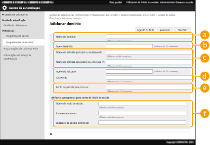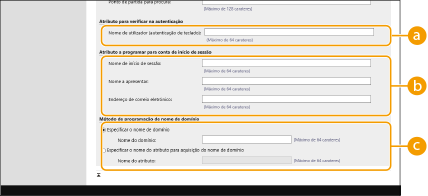 Selecione como programar o nome do domínio do destino de início de sessão. Para especificar o nome do domínio diretamente, selecione [Especificar o nome de domínio] e introduza o nome do domínio. Para especificar um campo de dados LDAP (nome do atributo) de onde adquirir o nome do domínio no servidor LDAP, selecione [Especificar o nome do atributo para aquisição do nome de domínio] e introduza o nome do atributo (Exemplo: dc).