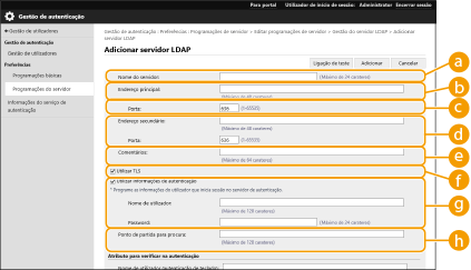 Se esta caixa de verificação estiver marcada, quando quiser alterar as definições em [Endereço principal] ou [Endereço secundário:] de um servidor LDAP, é necessário inserir a palavra passe especificada em [Password:] em [Utilizar informações de autenticação].