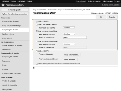 Desativar o SNMPv1Se o SNMPv1 estiver desativado, algumas funções da máquina ficam indisponíveis (por exemplo, a obtenção de informações da máquina através do controlador de impressora).