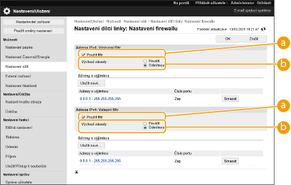 Vyberete-li tuto volbu, pak komunikační pakety, které jsou odeslány nebo přijaty ze zařízení, jejichž IP adresy jsou zadány v seznamu [Adresy s výjimkou], budou blokovány. Komunikace s ostatními zařízeními je povolena.