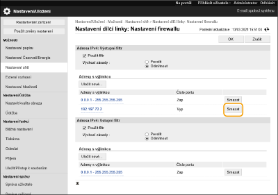 [Nastavení sítě] [Výpis bloku IP adresy]. Historii zablokovaných komunikací lze vyexportovat z Remote UI (Vzdálené UR) v souborovém formátu CSV. Export výpisu jako souborJe-li položka [Výchozí zásady] nastavena na [Odmítnout], v části [Výpis bloku IP adresy] se nezobrazí historie komunikace zablokované bránou firewall.