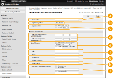 Zadejte počáteční a koncové datum platnosti certifikátu. [Datum konce platnosti (RRRR/MM/DD)] nelze nastavit na datum, které předchází datu v položce [Datum počátku platnosti (RRRR/MM/DD)].