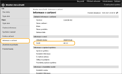 Za účelem přidávání nových funkcí nebo vyřešení problémů se stávajícími funkcemi je vydáván nový firmware. Je-li nový firmware k dispozici, aktualizujte stroj níže uvedeným postupem. Pro provedení aktualizace firmwaru jsou vyžadována přístupová práva administrátora.