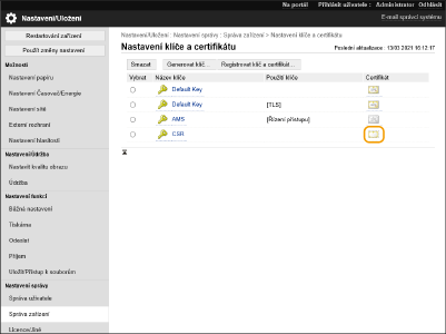 Na stroji můžete vygenerovat klíč a CSR (Certificate Signing Request – žádost o podepsání certifikátu). Data CSR můžete také zobrazit na displeji a exportovat je jako soubor.