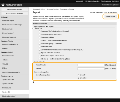 Chcete-li šifrovat všechna data nastavení, vyberte možnost [Úroveň 2] v části [Úroveň zabezpečení].