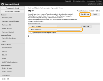 Do [Heslo dešifrování] zadejte stejné heslo, které bylo zadáno, když byla data nastavení exportována.