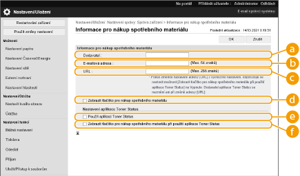 Můžete nastavit odkaz na web pro nákup spotřebního materiálu, který se zobrazí při kontrole informací o spotřebním materiálu z Remote UI (Vzdálené UR). Nastavení odkazu na web usnadňuje uživatelům nákup spotřebního materiálu.