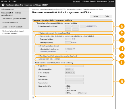 Nastavení nelze aktualizovat, pokud je vybráno [Povolit časovač automatické žádosti o vystavení certifikátu]. Vyžádání, aby byl certifikát vydán ve stanovenou dobu