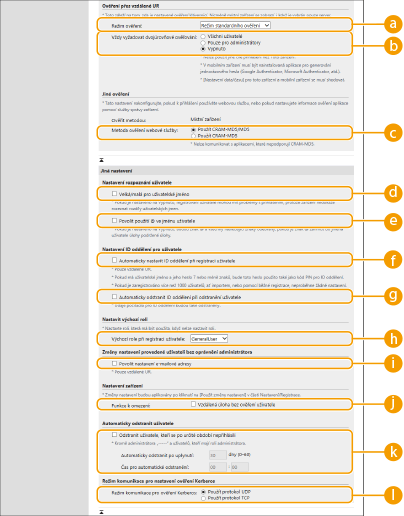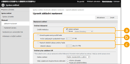 Na stroji můžete nastavit způsoby pro přihlašování uživatelů do systému stroje, ověřovací zařízení a jiné ověřovací funkce podle vašeho systémového prostředí a potřeb.