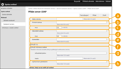 Zadejte číslo portu používaného ke komunikaci se serverem LDAP. Použijte stejné nastavení, které je zadané na serveru. Jestliže číslo nezadáte, automaticky se nastaví na „636“, když je zaškrtnuté políčko [Použít TLS], nebo se nastaví na „389“, když políčko zaškrtnuté není.