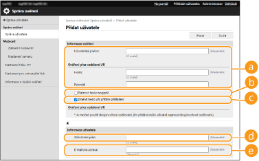 Uložení ID oddělení jako uživatelské jménoPokud kliknete na [Přidání uživatele pomocí ID oddělení...] na obrazovce v kroku 4, bude uložen nový uživatel se stejným jménem jako ID oddělení. Pokud je použito ověřování pomocí klávesnice, ověření lze provést pomocí pouze numerické klávesnice.