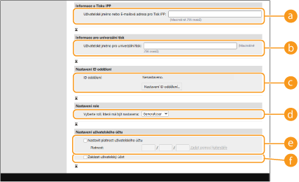 Pokud se uživatelské jméno skládá z čísel a obsahuje sedm nebo méně číslic, stejné číslo bude přiřazeno ke stejnému uživateli jako ID oddělení. Pokud je heslo stejného uživatele uloženo jako číslo, které má sedm číslic nebo méně, bude také nastaveno jako PIN pro dané ID oddělení.