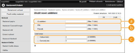 Pokud se přihlásíte s právy administrátora (správce), ID a PIN správce systému se automaticky přiřadí a zpracují jako ID oddělení.