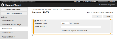 S pomocí SNTP můžete zkontrolovat stav komunikace mezi zařízením a uloženým serverem. Provede se však pouze kontrola stavu komunikace a nastavení času se neprovede.