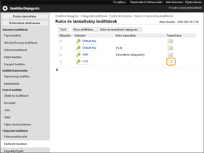 A készüléken előállított tanúsítványok nincsenek CA aláírással ellátva, ami egyes kommunikációs partnerek esetében kommunikációs hibákat okozhat. CA aláírással ellátott tanúsítvány igényléséhez tanúsítvány-aláírási kéréshez (CSR) kapcsolódó adatok szükségesek. CSR-t rendszergazdai jogosultságokkal bejelentkező felhasználók állíthatnak elő.