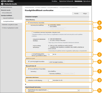 Az LDAP-szerverhez való névtelen hozzáférés engedélyezéséhez törölje a jelölőnégyzet bejelölését. Csak akkor érvényes, ha az LDAP-szerver is úgy van beállítva, hogy engedélyezze a névtelen hozzáférést. Ha a hitelesítéshez a felhasználónevet és a jelszót használja, jelölje be a jelölőnégyzetet, és írja be a [Felhasználónév:] és [Jelszó:] mezők értékeit.