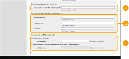 A bejelentkezési rendeltetési hely tartománynevének beállítási módját adhatja meg. A tartománynév közvetlen megadásához válassza a [Tartománynév megadása] lehetőséget, és írja be a tartománynevet. Olyan LDAP-adatmező (attribútumnév) megadásához, amelyből az LDAP-szerveren kiolvasható a tartománynév, válassza a [A tartománynév megállapításához használandó attribútumnév megadása] lehetőséget, és írja be az attribútumnevet (Példa:dc).