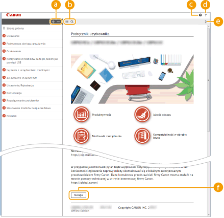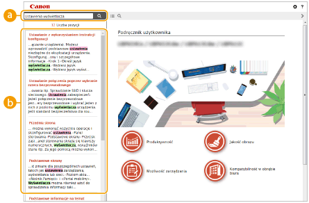 Kliknięcie tego elementu powoduje wyświetlenie instrukcji dotyczących otwierania Podręcznik użytkownika, wyszukiwania oraz innych informacji.