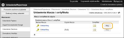 Kliknij [Użyj] dla klucza i certyfikatu, które mają być używane w komunikacji szyfrowanej TLS.