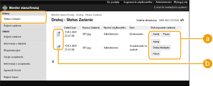 Uruchom interfejs Remote UI (Zdalny interfejs użytkownika)  [Monitor stanu/Anuluj]  [Status Zadania] w obszarze [Drukuj]