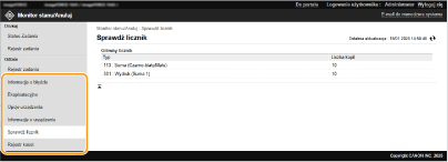 Możesz sprawdzić szereg informacji na temat urządzenia, na przykład informacje o błędach, ilość pozostałego papieru i tonera, informacje na temat dołączonego wyposażenia opcjonalnego oraz całkowitą ilość wydrukowanych stron.