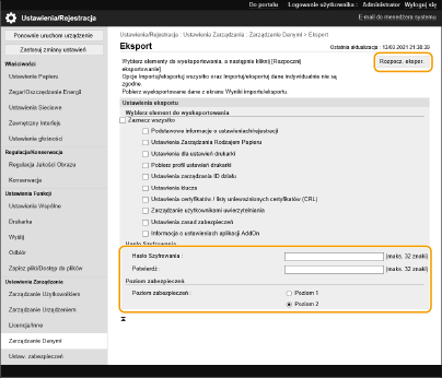 Aby zaszyfrować wszystkie dane ustawień, wybierz opcję [Poziom 2] w sekcji [Poziom zabezpieczeń].