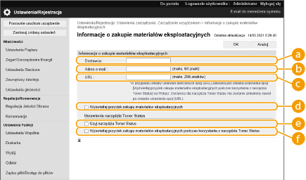 Wybierz tę opcję, aby wyświetlić przycisk dostępu do witryny internetowej umożliwiającej zakup zasobników z tonerem w interfejsie Remote UI (Zdalny interfejs użytkownika).