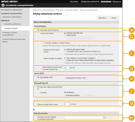 Określ limit czasowy podejmowania prób nawiązania połączenia z serwerem uwierzytelniającym i limit czasowy oczekiwania na odpowiedź. Gdy opcja [Zapisz informacje dotyczące uwierzytelniania dla logujących się użytkowników] jest włączona, a użytkownik nie mógł zalogować się w określonym tutaj limicie czasowym, podejmowana jest próba logowania z wykorzystaniem danych uwierzytelniających zapisanych w pamięci podręcznej.